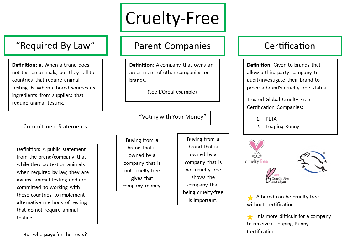The Cruelty-Free conversation includes three different categories, “Require by Law,” Parent Companies, and Certifications. I made this graphic lay out the conversation. Please let me know if I need to elaborate on any of these categories. Click on the image to enlarge it in a new tab.