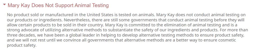 Mary Kay would fall into the “Required by Law” category for those who remember my Cruelty-free research article because they sell their products in China.